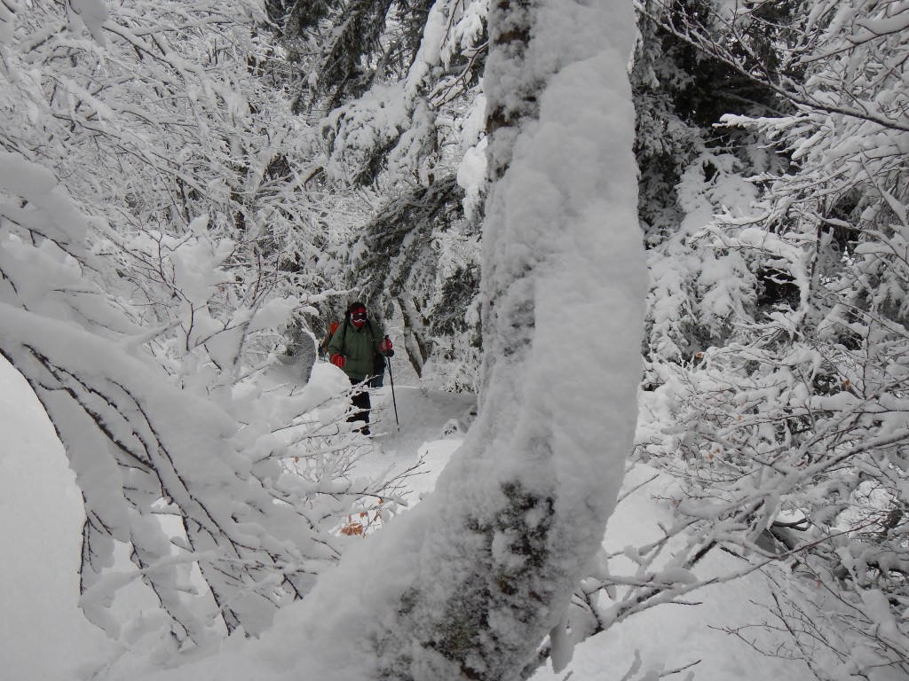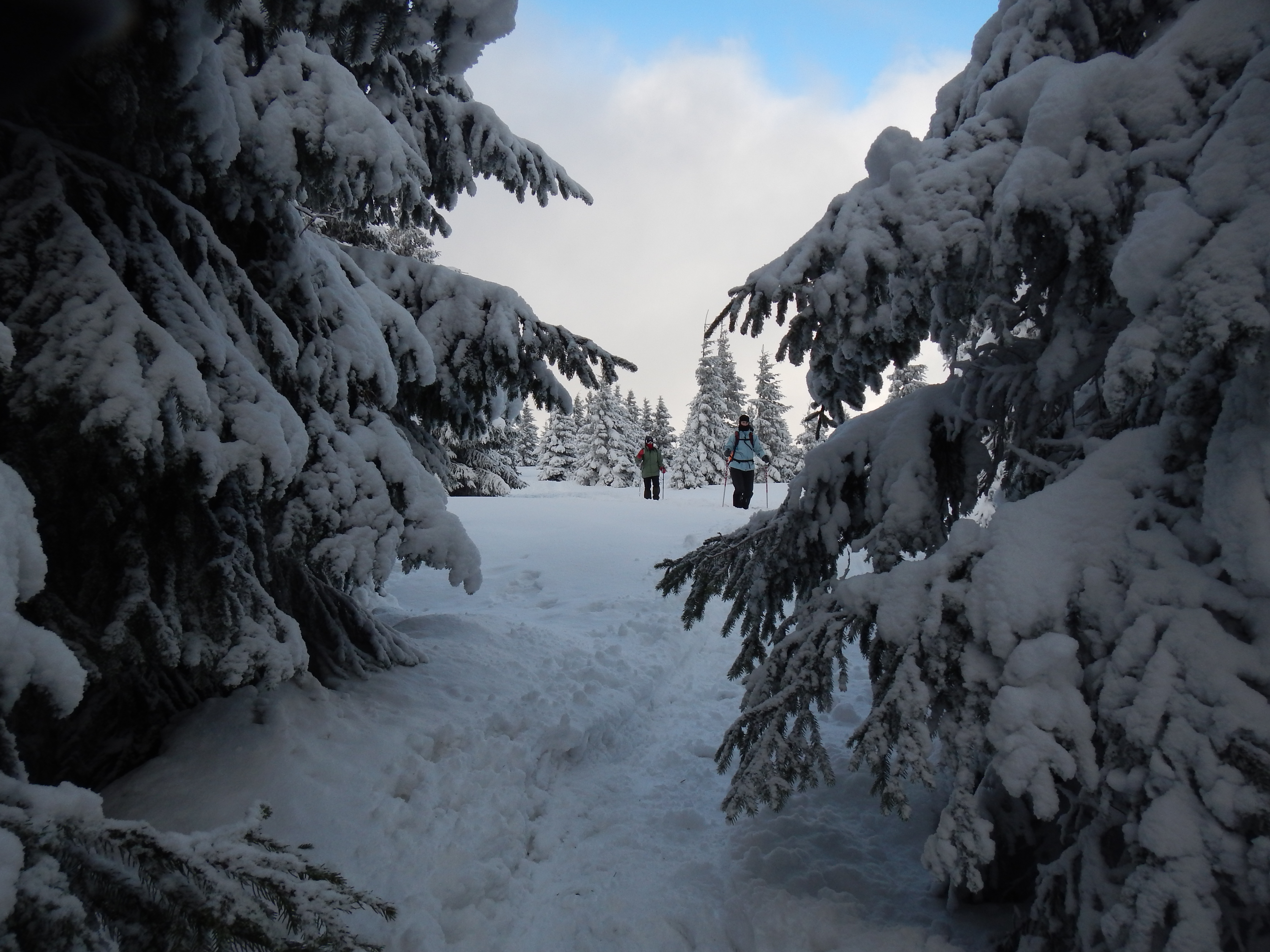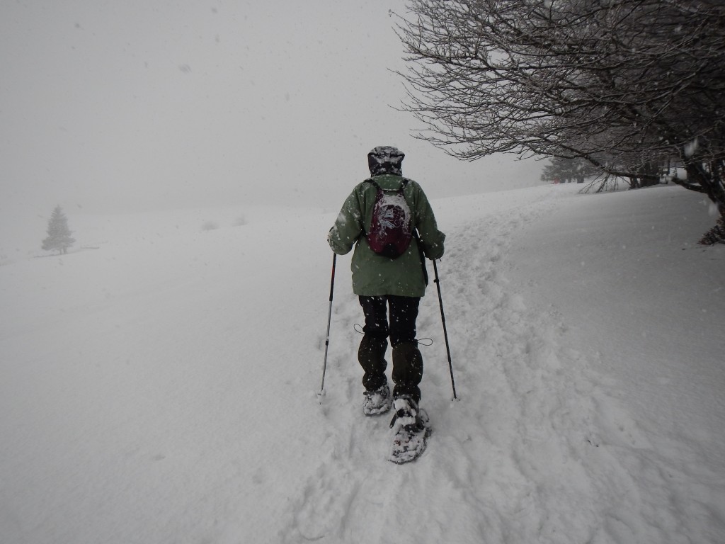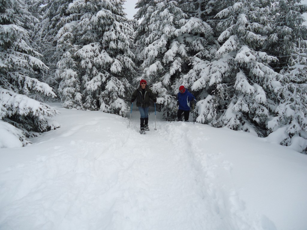 Transport en covoiturage, pique-nique au centre et changement de programme pour le premier jour afin d’aller chercher la neige à plus de 1200 m : sortie sur le Hohneck dans la neige et le vent. Après 3 heures de marche, retour au centre pour une bonne douche. Une fois requinquée, la bande s’est retrouvée devant une bonne boisson dans un pub à Gérardmer. Après une bonne raclette qui a nous a permis d’emmagasiner les calories nécessaires à la sortie du lendemain, direction le lit dans nos chambres toutes neuves et confortables. Y avait-il un message, mais on a eu droit cette année aux chambres pour personnes à mobilité réduite…
