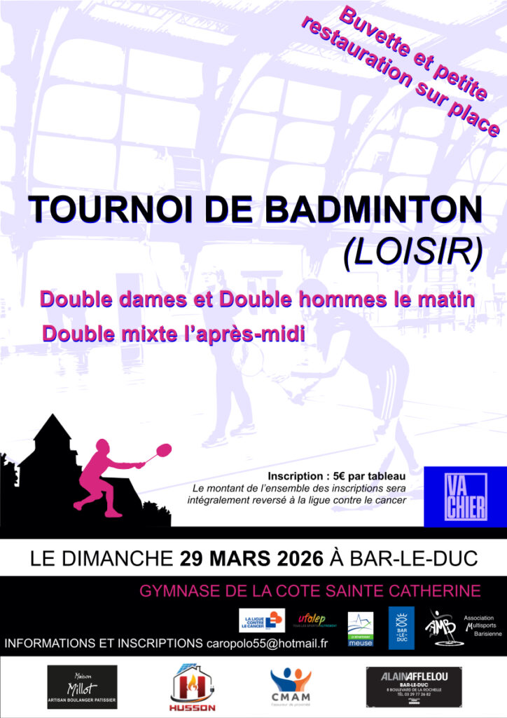 Notre tournoi mars bleu a réuni 54 badistes ce dimanche 29 mars dans la convivialité. Il nous a permis de recueillir 400€ d’inscriptions qui ont été intégralement reversés à la Ligue contre le Cancer de la Meuse. Un grand merci aux bénévoles qui ont contribué à la réussite de cette journée.